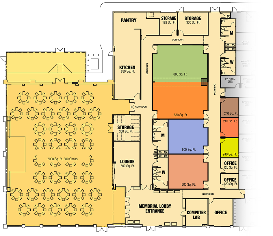 To utilize available rooms throughout the veterans hall simply click on any room depicted below to view its individual features. You'll be able to learn more about the size of each room, its seating capacity, and other pertinent information. Each room feature page contains a link/button to access its specific room event calendar. you'll be able to explore the availability of the room. If you're interested in utilizing the room for your meetings a phone number is provided to discuss your meeting room requirements.