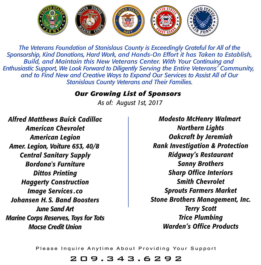 The Veterans Foundation of Stanislaus County announces with great pride and appreciation the names of those private citizens, organizations, and businesses that have partnered with us by donating generously to establish and maintain the Veterans Hall as well as this Foundation.